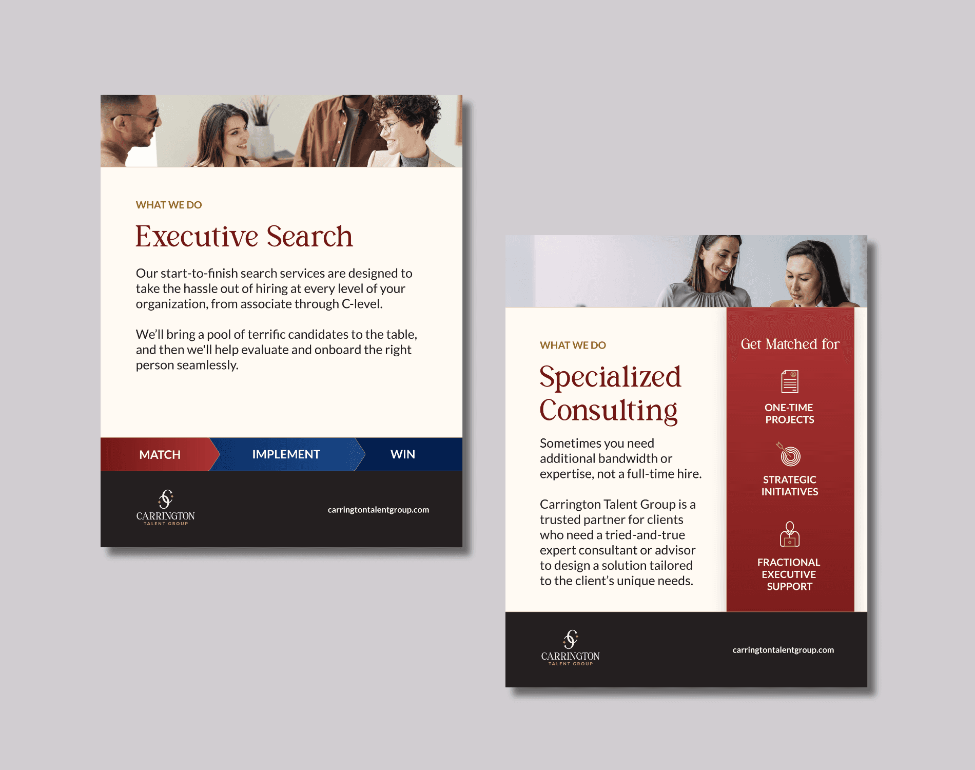 Carrington Talent Group has come a long way since they first launched in 2019. In 2024, they felt it was time to further refine their identity to better reflect the curated services they provide and the clients that they serve. Because they work with tenured professionals who value quality, care, and trust, the design process centered around elegant type, rich reds and blues, and gold accents/details.